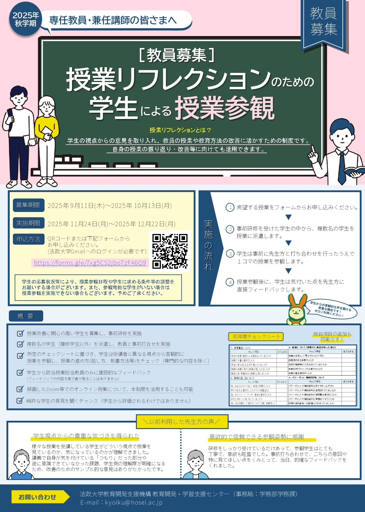 「授業リフレクションのための学生による授業参観」制度を実施しています。