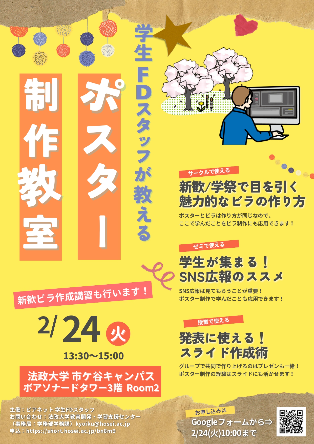 このたび、ピアネット活動、サークル、ゼミ、新歓などの広報に役立つ「学生FDスタッフが教えるポスター制作教室」を開催します。